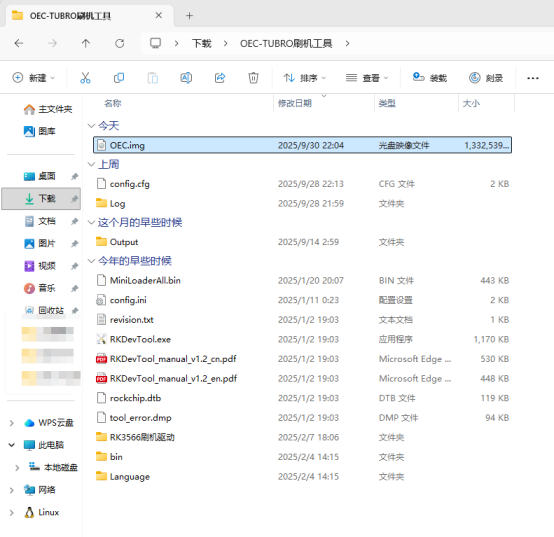 首先下载好 OEC TUBRO 刷机工具和 One-KVM 整合包,解压好相关文件,进入刷机目录。这里建议把解压后的 One-KVM 镜像重命名为更短的名字(如 OEC.img)放到刷机工具目录下,这样不会因为文件名太长看不见刷机进度。
