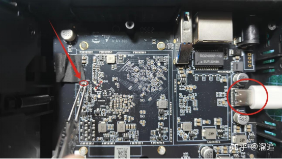 然后开始短接电阻刷机。先短接电阻(和网上其他教程短接焊接点是同一个作用),再插入TypeC数据线(刷机过程不需要接DC 12V 供电),2秒左右后松开短接工具。这时候软件提示发现一个 MASKROM 设备,点击软件界面的执行按钮,等待下载数据烧录即可。